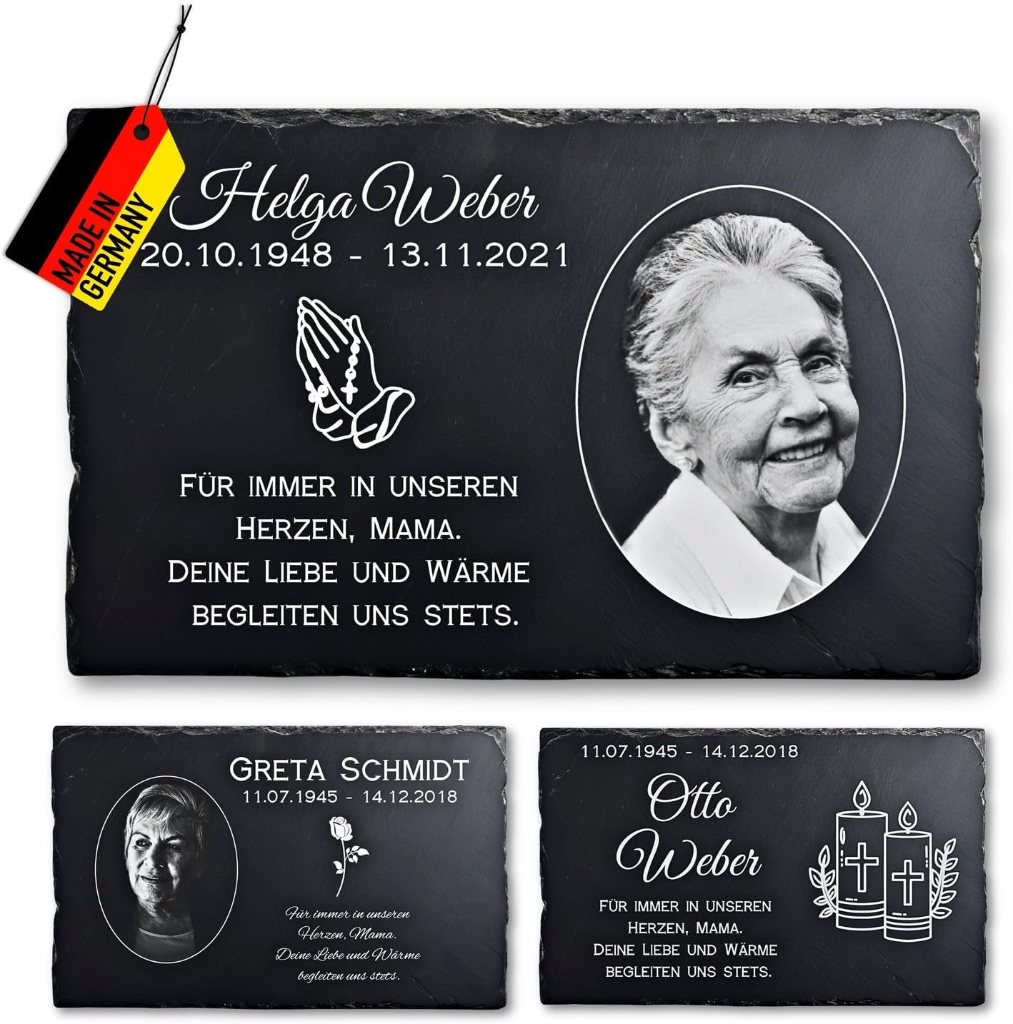 This personalized slate memorial plaque is a stylish keepsake in memory of a loved one, honoring and preserving their memory in a dignified way. Each memorial plaque is individually crafted with the utmost care to ensure a deeply personal touch. It can be engraved with the deceased's name, date of birth and death, and optionally with a touching photo or a wish motif, creating a truly unique keepsake. The sturdy natural slate is not only aesthetically pleasing but also highly durable: it is weatherproof and UV resistant, making it ideal for long-term outdoor use as a gravestone. At the same time, it serves indoors as a dignified and durable memento. Each personalized slate memorial plaque features its natural texture with unique grain and raw edges, making each piece unmistakably one-of-a-kind. This stylish keepsake is more than just a plaque; it is a lasting tribute that endures forever and keeps the memory of your loved ones alive.