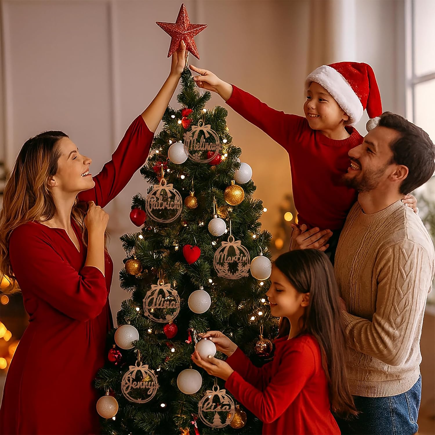 Nuestros colgantes de Navidad de madera grabados individualmente añaden un toque de estilo a su árbol o son un bonito regalo de Navidad. Cada colgante se graba con precisión con su nombre y un motivo cuidadosamente seleccionado mediante un moderno grabado por láser. El resultado es una pieza de decoración única que crea un ambiente navideño cálido y personalizado.
